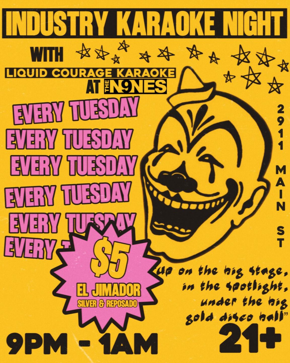 Up on the big stage, in the spotlight, under the big, gold disco ball! Industry Nite specials and $5 el Jimador Tequila all night! Hosted by:Liquid Courage Karaoke Every Tuesday 9pm-1amNo cover21+